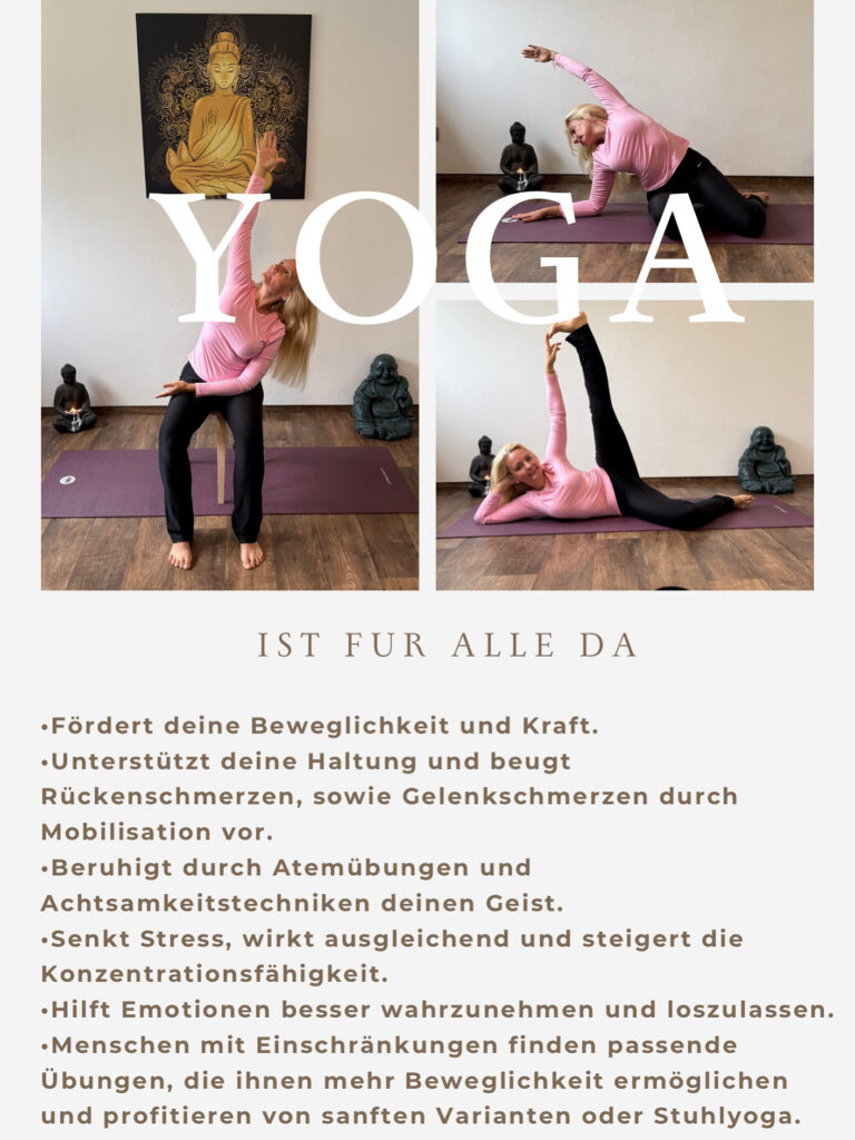 Aus ganzheitlicher Sicht betrachte ich dein Anliegen und entwickle ein speziell auf deine Bedürfnisse zugeschnittenes Programm. Yoga dient als Impuls deine Selbstheilungskräfte zu aktivieren.